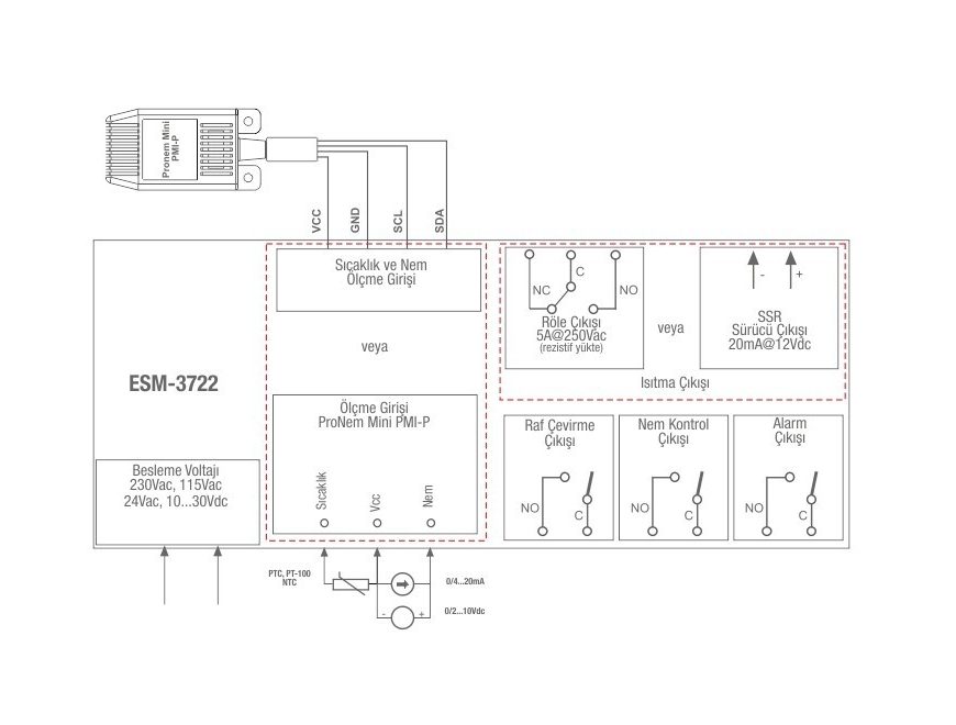 | Sensör Girişi | NTC, PTC, Pt-100, 0/2..10V DC, 0/4…20mA DC veya Pronem Mini PMI-P |